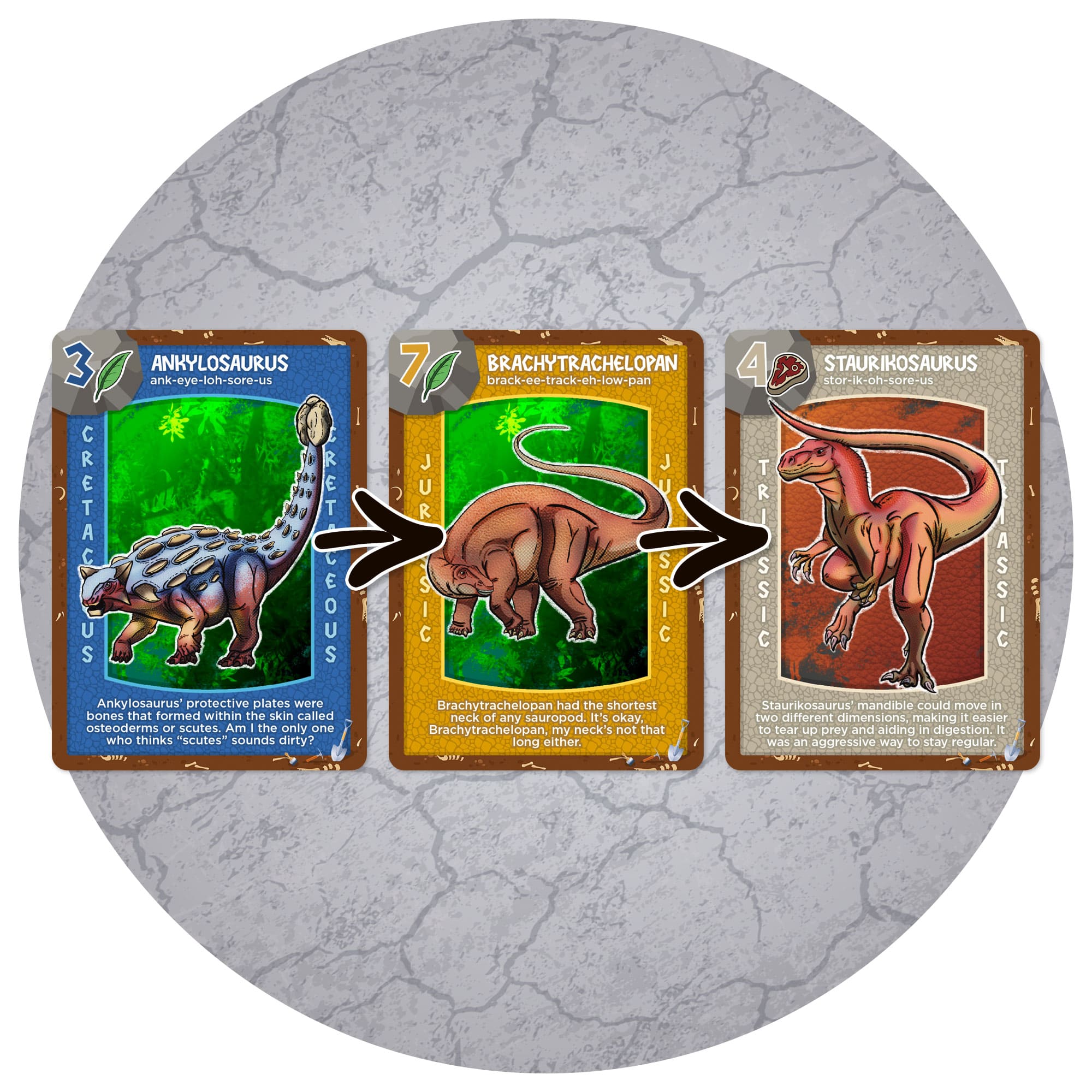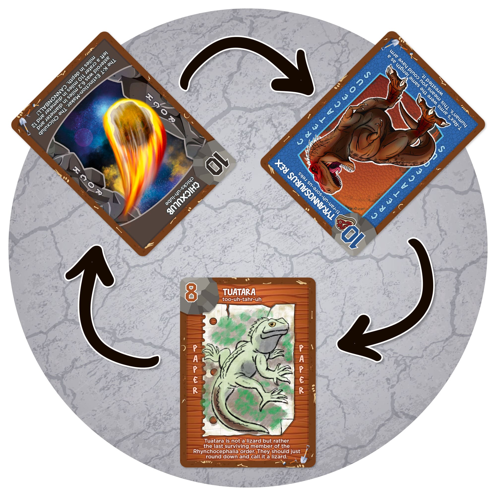 Everyone shouts “Rock, Paper, Saurus!” and lays down their card.  Cards have values from 1 to 10 and ranked mesozoic periods; Jurassic beats Triassic and Cretaceous beats them all.